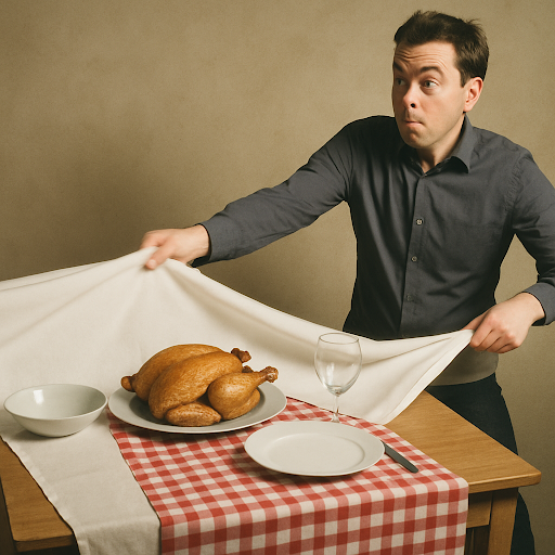 Observation: The cups should remain largely undisturbed. The inertia of the cups keeps them in place while the cloth is removed quickly enough to minimize the effects of friction.